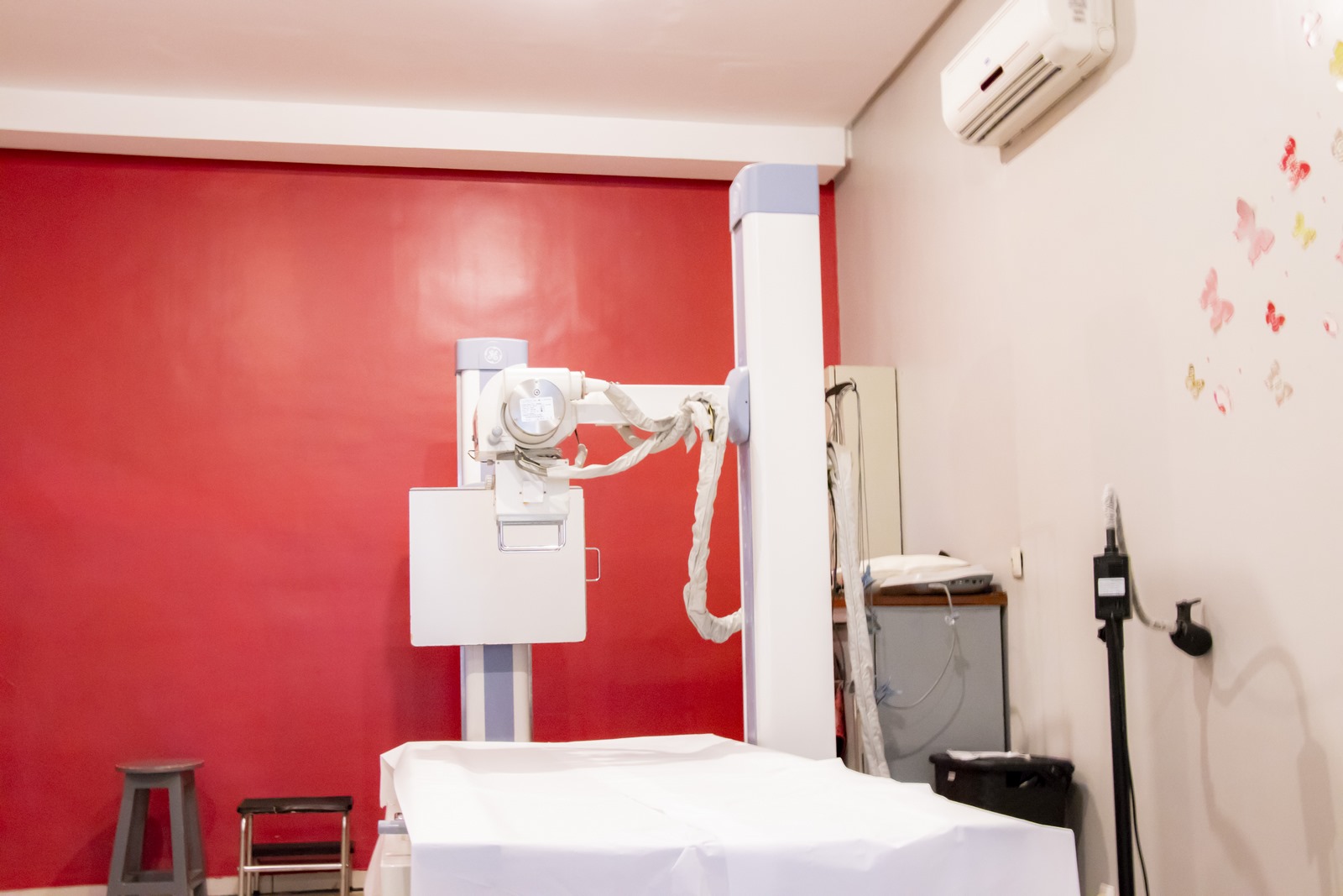 La zone du corps à examiner est positionnée devant un appareil qui transforme les rayons en images.